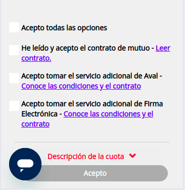 En RapiCredit, los costos opcionales te ayudan a agilizar el proceso de solicitud de tu préstamo en línea. Estos costos son el Aval y la Firma Electrónica. Si decides no tomarlos puedes desactivar las casillas correspondientes al momento de confirmar la solicitud de tu crédito.